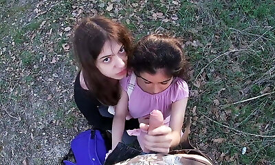 Sis gives a oral pleasure while taking a walk in the woods outdoor