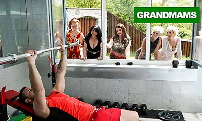 Fit gym teen rides oldie in cowgirl pose