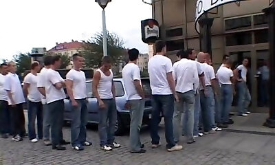 Slutty dark-haired fucked stiff by 30 men in this gangbang film