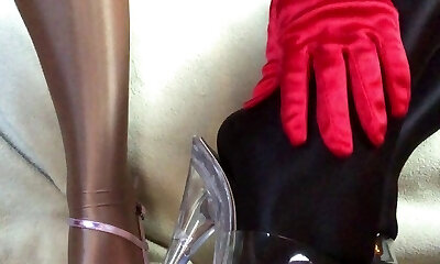 Sensual teasing close up legs and feet in Glossy glossy stocking and high heels.